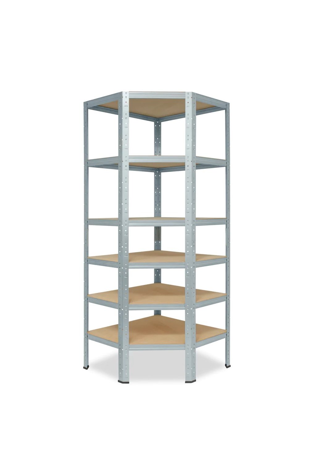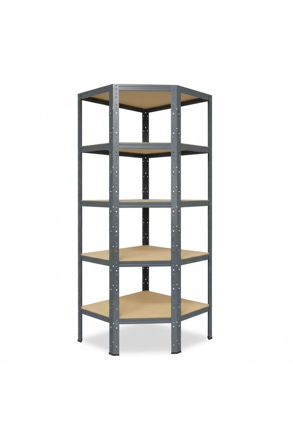Rohový kovový regál pre skladovanie do rohových priestorov. HDF dosky majú hladší povrch, sú pevnějšie ako klasická drevotrieska. Pokial to priestor dovolí, dokúpťe si dalšie regále o výške 200 cm a hľbke 45 cm z našej ponuky.